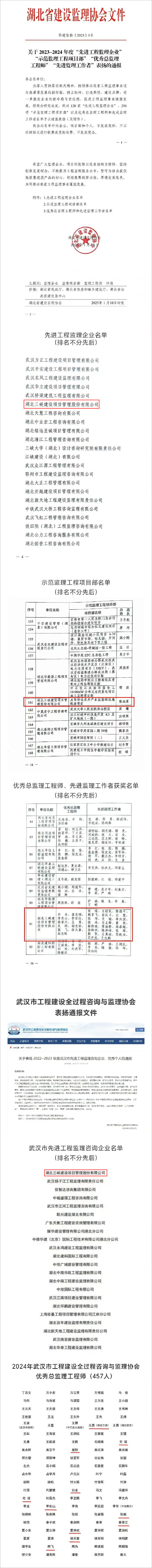 近日,在湖北省建设监理协会发布的2023-2024年度省级“先进工程监理企业”、“示范监理工程项目部”、“优秀总监理工程师”、“先进监理工作者”和武汉市工程建设全过程咨询与监理协会发布的2022-2023年度武汉市“先进工程监理咨询企业”、“优秀个人”的评选结果公告中,完美体育网址再获殊荣。 此次评选结果,完美体育网址荣获2023-2024年度省级“先进工程监理企业”、2022-2023年度武汉市“先进工程监理咨询企业”荣誉称号;点军桥边农卉产业园基础设施配套项目监理部荣获“省级示范监理工程项目部”荣誉称号;谢忠安、秦晋江、白全、李东山、李世红、王勇、吴刚、熊飞、徐天喜、赵志刚荣获“省级优秀总监理工程师”荣誉称号;白全、杜波、熊飞、徐天喜、夏忠斌、秦晋江、张瑜、李东山、文瑞、王勇、吴刚荣获“武汉市优秀总监理工程师”荣誉称号;鲍宇飞、陈恭铭、陈俊平、陈泽峰、董亮、都啟斌、范晓光、黄清桥、荆凯、李兴波、倪玮、孙岭洲、汪慧、王旺民、王勇政、王志鹏、文瑞、肖王锋、张辉、张伟、张瑜、左开亮荣获“先进监理工作者”荣誉称号。